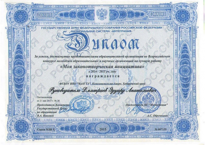 Комсомольский-на-Амуре государственный технический университет в лице ректора КнАГТУ Э.А. Дмитриева был отмечен дипломом за успехи, достигнутые представителями образовательной организации во Всероссийском конкурсе молодежи образовательных учреждений и научных организаций на лучшую работу «Моя законотворческая инициатива».