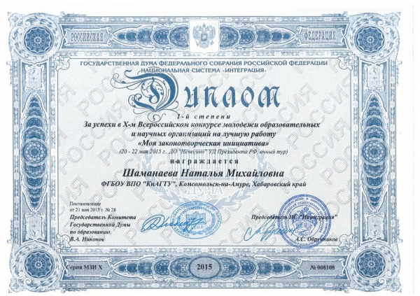 Студентка группы 3ЮРб-2 Комсомольского-на-Амуре государственного технического университета Наталья Шаманаева успешно прошла конкурсный отбор на заочном этапе и была удостоена звания лауреата Всероссийского заочного конкурса молодежи образовательных учреждений и научных организаций на лучшую работу «Моя законотворческая инициатива».