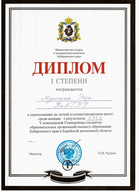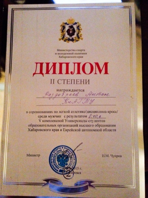 В соревнованиях по легкой атлетике (дисциплина кросс) в личном зачете студенты КнАГТУ также успешно выступили: Роза Мурыгина завоевала первое место среди женщин, Оксана Чудина заняла третье место. Антон Раздобреев пришел к финишу вторым, став обладателем диплома II степени в соревнованиях по легкой атлетике (дисциплина кросс) среди мужчин.