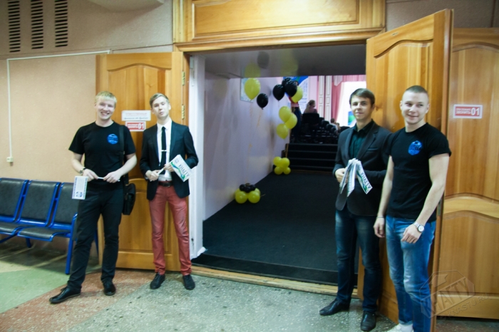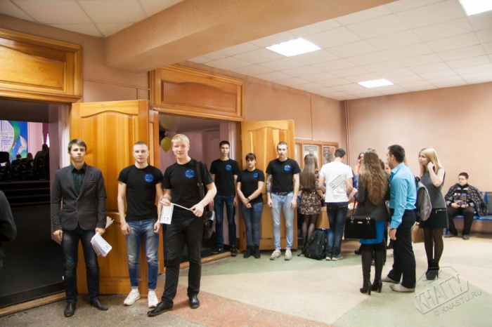 Представители студенческого самоуправления приветствовали первокурсников на входе в Актовый зал, вручая праздничные флажки с официальной символикой КнАГТУ.