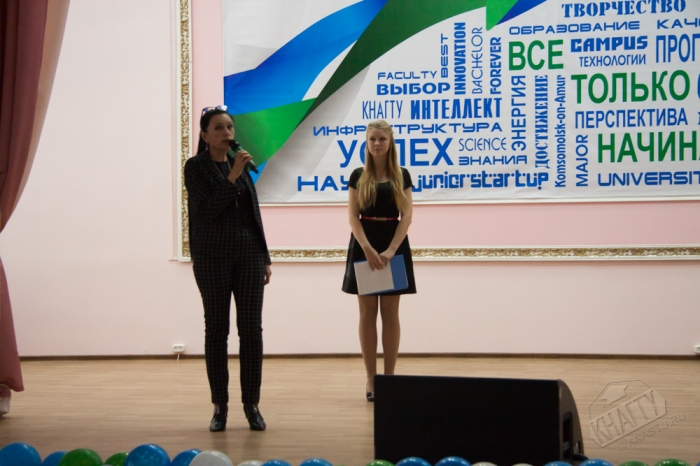 «Хочу поблагодарить вас, за то, что в качестве Альма-матер вы выбрали лучший на Дальнем Востоке России – Комсомольский-на-Амуре государственный технический университет. Уважаемые первокурсники, мы открыли для вас все учебные аудитории, лаборатории, библиотеки, спортивные залы. Мы видим, какое большое количество первокурсников уже записалось в научные сообщества, кружки и студии университета. Учиться в КнАГТУ всегда было престижно, потому, что инженерные профессии сегодня востребованы, а формированию активной гражданской позиции в вузе уделяется особое внимание. Мы горды тем, что в числе выпускников университета губернатор Хабаровского края В.И. Шпорт и мэр города Комсомольска-на-Амуре А.В. Климов. Ваше будущее в ваших руках. Дерзайте, станьте лучшими в КнАГТУ», - обратилась к первокурсникам Т.Е. Наливайко.