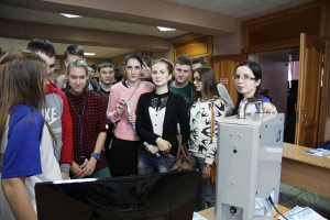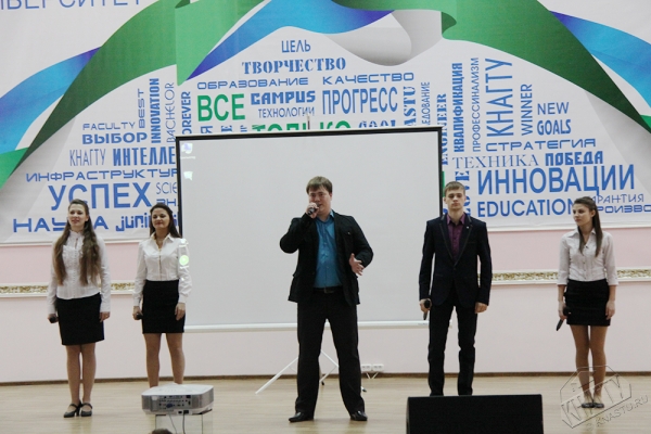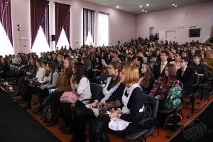 В холле перед актовым залом КнАГТУ проходили презентации университетов Хабаровского края. Здесь старшеклассникам раздавали буклеты об университетах, в которых содержалась подробная информация о направлениях и специальностях подготовки.