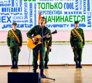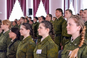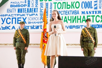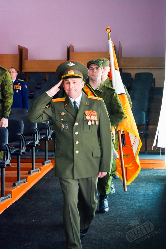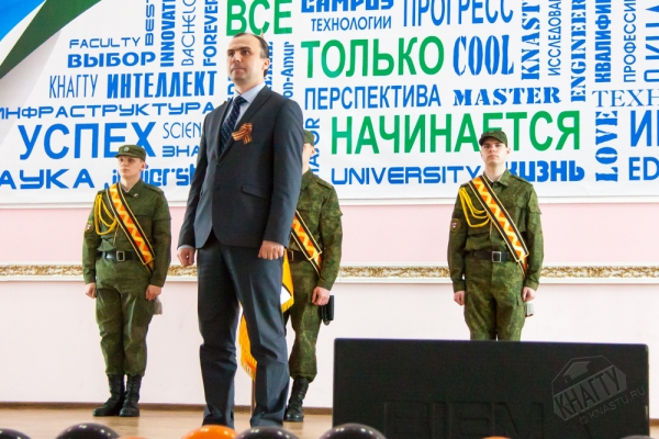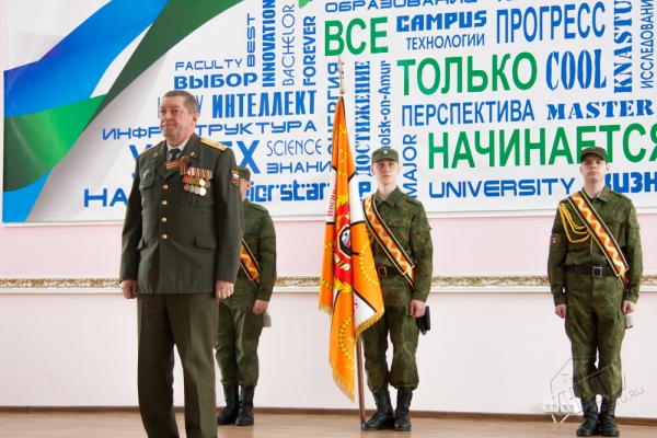 В нем приняли участие офицеры и курсанты военной кафедры, преподаватели, сотрудники и студенты вуза. Началось мероприятие с торжественного внесения в актовый зал КнАГТУ знамени военной кафедры и исполнения Государственного гимна Российской Федерации.