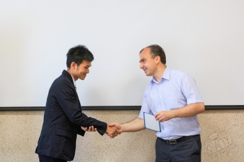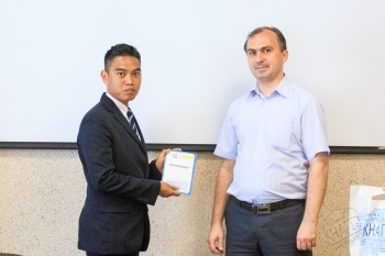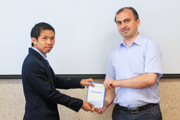 Вручал сертификаты иностранным слушателям первый проректор КнАГТУ И.В. Макурин. Он поздравил выпускников с окончанием обучения и пожелал хороших, а главное полезных и продуктивных летних каникул: «Поздравляю вас с окончанием учебного года и хочу отметить проявленное вами усердие в обучении. Надеюсь, что вы с таким же упорством продолжите обучение в магистратуре КнАГТУ. В новом учебном году вам предстоит начать изучение различных технических дисциплин по профилю вашего обучения. Уверен, что у вас все получится, и будущее развитие кораблестроения Республики Союза Мьянмы окажется в ваших надежных и профессиональных руках».