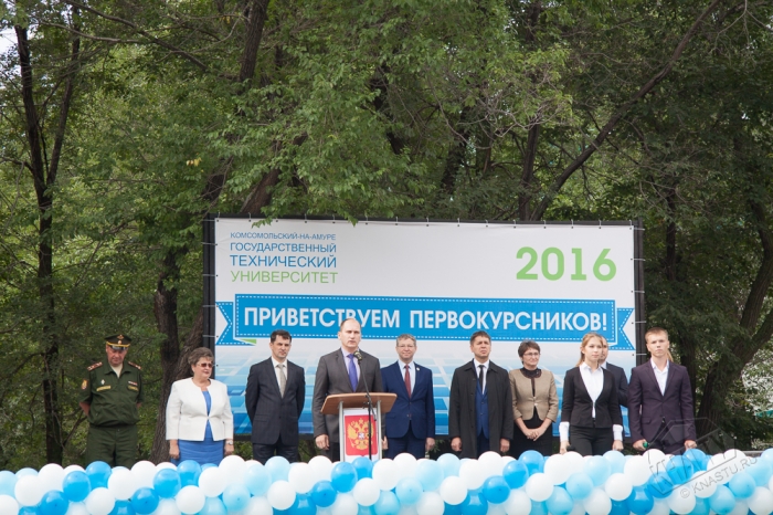 «Сегодня вы стали студентами одного из крупнейших на Дальнем Востоке вуза - Комсомольского-на-Амуре государственного технического университета. За годы обучения в КнАГТУ вы станете не только специалистами, но и достойными гражданами нашего города и страны. Для вашего развития в университете созданы все условия для научно-исследовательской работы студентов в студенческих конструкторских бюро и исследовательских лабораториях. В университете развита система студенческого самоуправления и организации внеучебной занятости студентов. На протяжении многих лет успешно функционирует военная кафедра известная своими выпускниками. Желаю вам успехов, сил, целеустремленности и яркой студенческой жизни», - сказал ректор КнАГТУ Э.А. Дмитриев.