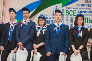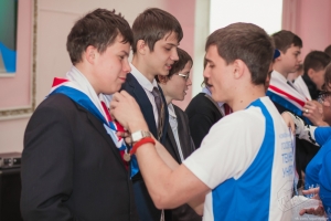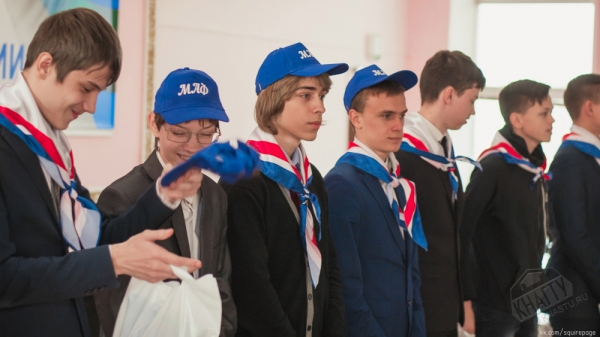 По традиции, новоиспечённым десятиклассникам студенты КнАГТУ повязали галстуки, окрашенные в цвета российского флага. А также надели на них кепки, как символ причастности к Малому авиационному факультету и Союзу машиностроителей.