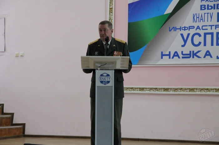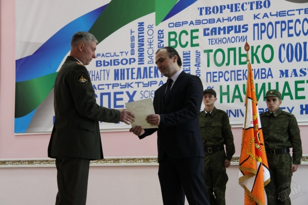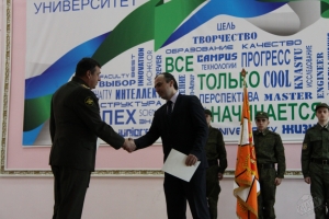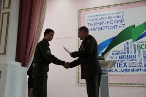 Затем полковник запаса В.А. Шутка зачитал приказ ректора университета о поощрении сотрудников военной кафедры. Первый проректор КнАГТУ И.В. Макурин и начальник военной кафедры С. И. Карпов вручили грамоты.