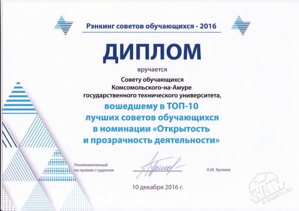 По результатам ренкинга Объединенный студенческий совет Комсомольского-на-Амуре технического университета вошел в число ТОП-10 лучших советов обучающихся ведущих вузов России в номинации «Открытость и прозрачность деятельности».