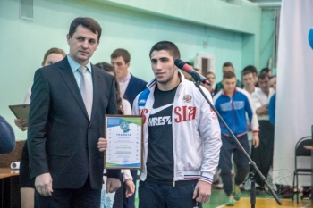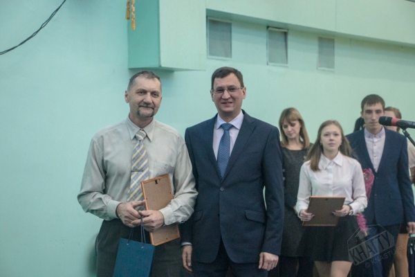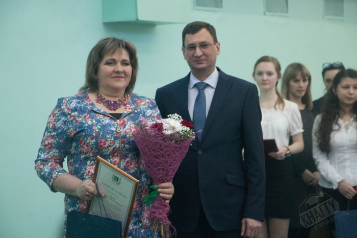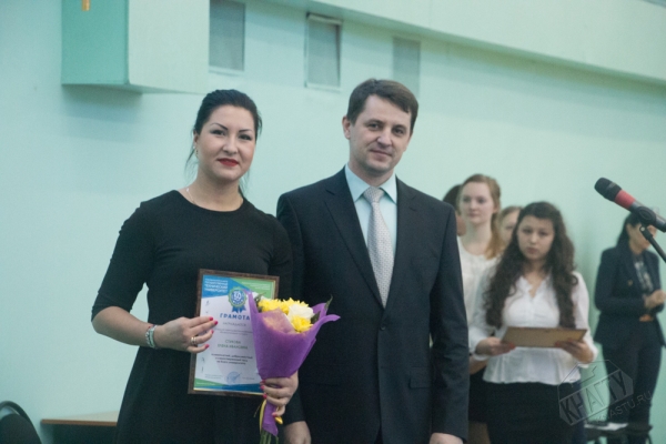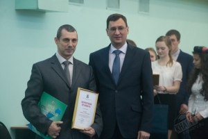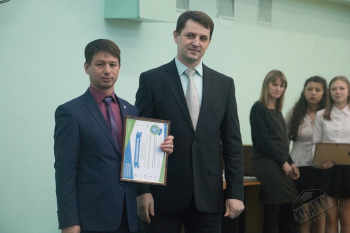 Глава города Юности А.В. Климов вручил почетные грамоты доценту кафедры, ответственному преподавателю за организацию и проведение спортивно-массовой работы со студентами И.М. Ткач и старшему преподавателю кафедры, тренеру по гиревому спорту А.М. Заплутаеву.