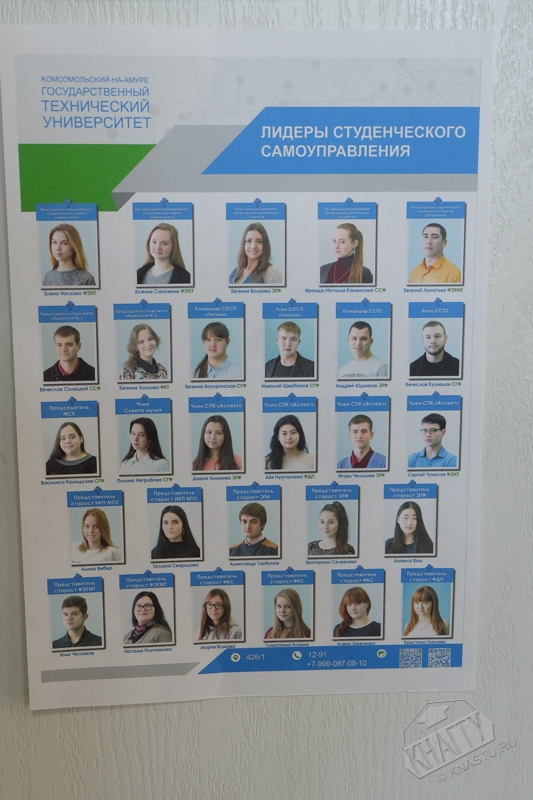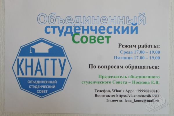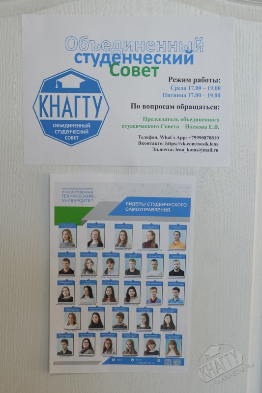 В соответствии с приказом ректора № 473-«О» от 02.12.2016 года осуществлена передача ауд. 426а главного корпуса университета в ведение Объединенного студенческого Совета, в структуру которого входят: международный студенческий клуб, первичная профсоюзная организация студентов КнАГТУ, студенческая организация «Совет Студенческих трудовых отрядов», студенческий психологический клуб «Аспект», студенческий отряд содействия правоохранительным органам - добровольная Дружина «Легион», студенческий Комитет по качеству образования, Студенческие советы общежитий № 2, 3 студгородка, студенческий Медиа-информационный центр, старостаты и студенческие советы факультетов (института).