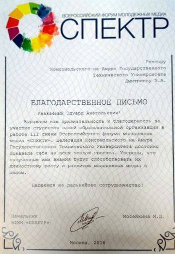 Студенческий медиацентр (СтудМИЦ) Комсомольского-на-Амуре государственного технического университета принял участие во Всероссийском форуме молодежных медиа «СПЕКТР».