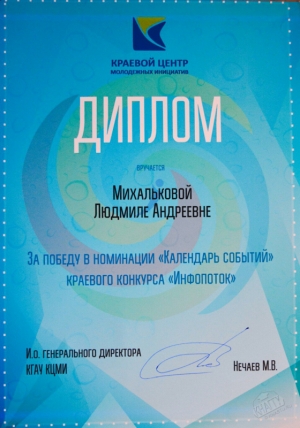 Поздравляем с победой в краевом конкурсе профессионального мастерства «Инфопоток» в номинации «Календарь событий» студентку института компьютерного проектирования машиностроительных технологий и оборудования, корреспондента газеты «Университетская жизнь в КнАГТУ» Людмилу Михалькову и в номинации «Фоторепортаж» редактора медиа-информационного Алёну Сарилову.