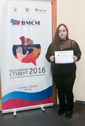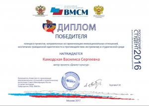 Проект «Диалог культур» был представлен на межнациональном студенческом форуме «Российский студент – 2016» в г. Москве. Его целью явилось укрепление социальной сплоченности российской нации посредством гармонизации межконфессиональных и межнациональных отношений, профилактики экстремизма в студенческой среде через развитие всероссийской сети интернациональных структур студенческого самоуправления.
