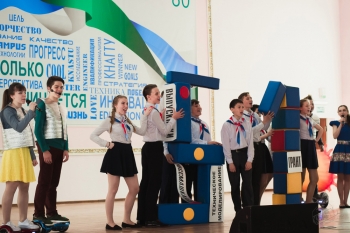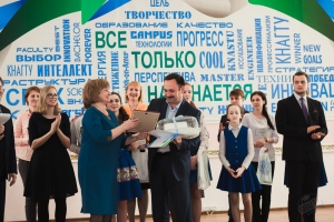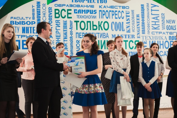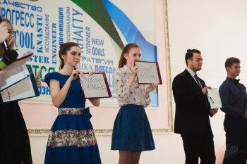 Но в тот день со сцены звучали не только слова поздравлений, вручались дипломы, но и дарились ценные призы: школе-победительнице – телескоп, институту-победителю – торт с фирменным логотипом Конкурса, победившему первокурснику – Apple iPad. Не остались без подарков и другие конкурсанты и группы поддержки от образовательных учреждений.