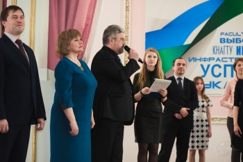 Студенты факультета экологии и химической технологии, представлявшие первую участницу Конкурса Дарью Стаценко, дружно маршировали на сцене под гимн нефтяной компании «Роснефть», а группа поддержки шестой участницы, Валентины Никитиной, студентки факультета компьютерных технологий, рассказала жюри и зрителям, какими будут технологии будущего.