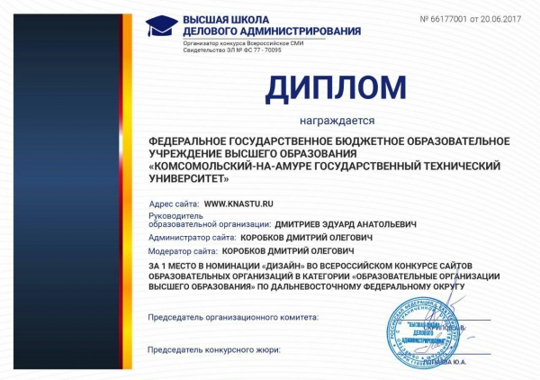 По результатам конкурса сайт КнАГТУ занял I место в номинации «Дизайн» в категории «Образовательные организации высшего образования» по Дальневосточному федеральному округу.