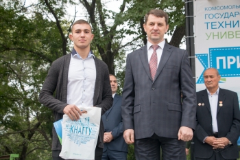 Впервые на торжественной линейке ректором университета Э.А. Дмитриевым были вручены золотой, серебряный, бронзовый студенческие билеты первокурсникам – активным участникам конкурсно-проектного блока «Университетский олимп», также трем лучшим студентам-спортсменам 1-го курса были подарены буклеты КнАГТУ с автографом терхкратного олимпийского чемпиона по греко-римской борьбе, Героя России А.А. Карелина, который посетил наш университет во главе делегации именитых спортсменов-борцов в рамках празднования 85-летия со дня образования города Юности.