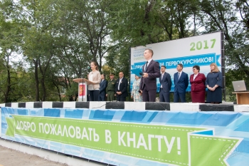 «Уважаемые первокурсники, лицеисты, преподаватели! Сегодня в наши ряды студенчества вливается более пятисот новых студентов. Как известно, студенческая жизнь – это не только самый запоминающийся период в жизни каждого человека, но и самый ответственный. Хотелось пожелать первокурсникам успехов, удачи и новых достижений! С Днем знаний!», ‒ сказал ректор КнАГТУ Э.А. Дмитриев.