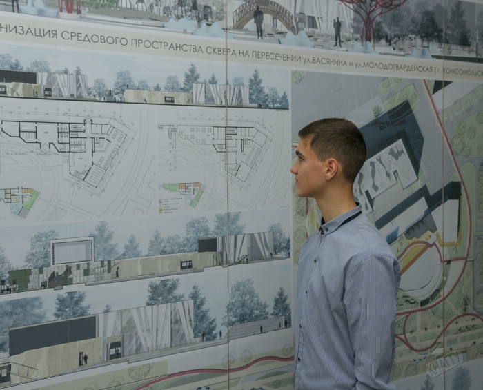 В холле перед актовым залом была организована выставка работ студентов-дизайнеров факультета кадастра и строительства направления «Дизайн архитектурной среды», где школьники смогли познакомиться с проектами, ориентированными в первую очередь на преображение городского пространства и на благоустройство дворовых территорий города Комсомольск-на-Амуре.