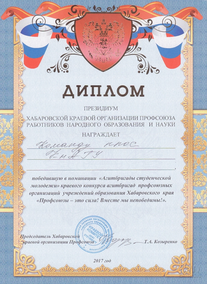 Команда профкома первичной профсоюзной организации студентов КнАГУ победила в номинации «Агитбригады студенческой молодежи». На конкурсе студенты презентовали номер на тему «Ты нужен профсоюзу – профсоюз нужен тебе!».