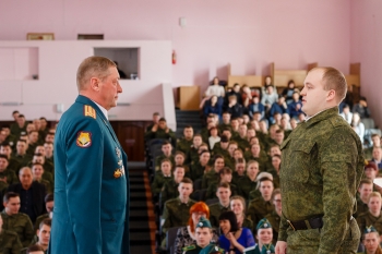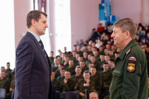 Затем начальник учебной части, заместитель начальника военной кафедры, подполковник запаса В.А. Шутка зачитал приказы. Ректор КнАГУ Э.А. Дмитриев и начальник военной кафедры С.И. Карпов вручили грамоты и благодарности.
