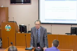 В начале мероприятия с информацией об особенностях приемной кампании 2018 года выступил ответственный секретарь приемной комиссии КнАГУ Г.М. Гринфельд. Было отмечено, что подать документы можно не только непосредственно обратившись в приёмную комиссию, но и удалённо, зарегистрировавшись на портале абитуриента Комсомольского-на-Амуре государственного университета по адресу: http://abit.knastu.ru. Особое внимание ответственный секретарь приемной комиссии обратил на учет индивидуальных достижений при формировании конкурсного балла абитуриента. Также в ходе встречи были отмечены преимущества, которые получают первокурсники, зачисленные в КнАГУ на очную форму обучения и набравшие по итогам трех вступительных испытаний от 200 баллов и более: это и возможность получения повышенной академической стипендии, размер которой может варьироваться от 8000 до 15000 рублей в месяц, и возможность возврата оплаты за обучение на подготовительных курсах.