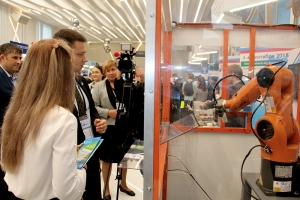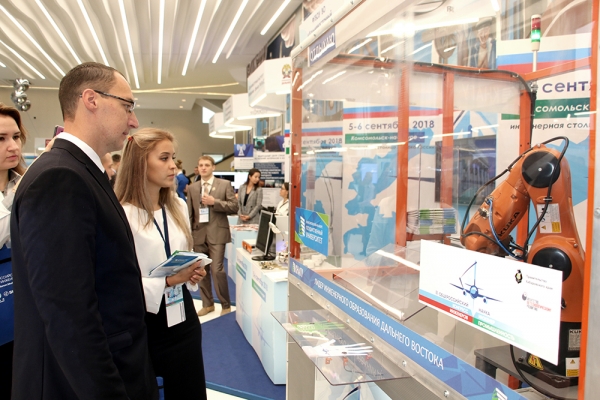 Экспозиция КнАГУ была представлена промышленным роботом KUKA, одним из роботов Научно-образовательного центра «Промышленная робототехника и передовые промышленные технологии» (НОЦ «ПРиППТ») КнАГУ, запрограммированным на раздачу буклетов вуза, в которых отражена информация об основных научных и инновационных центрах университета. В своей речи губернатор Хабаровского края В.И. Шпорт и генеральный директор ООО «Кука Роботикс Рус» Д.Е. Капишников отметили высокую важность открытия НОЦ «ПРиППТ» в городе не только для университета в частности, но и для развития региона в целом.