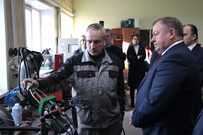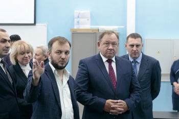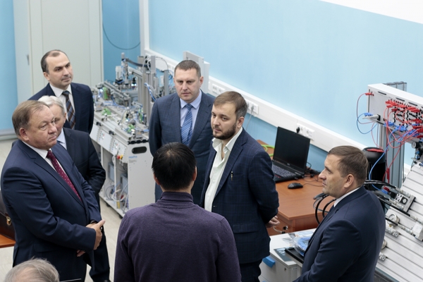 Далее делегация побывала в научно-образовательном центре «Промышленная робототехника и передовые промышленные технологии», где проводятся научно-исследовательские и опытно-конструкторские работы в области технологического применения промышленных роботов и разработки крупных автоматизированных систем. Декан электротехнического факультета А.С. Гудим продемонстрировал гостям оборудование, реализующее реальные технологические процессы, – сборочно-сварочную роботизированную ячейку и роботизированную ячейку механической обработки.