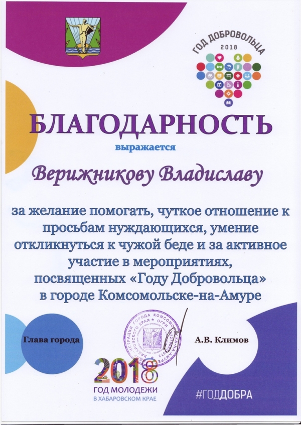 Студены КнАГУ приняли активное участие на всех площадках, входящих в программу приёма. В рамках форума состоялась церемония награждения волонтёров города. За активное участие в мероприятиях, посвящённых Году добровольца в г. Комсомольске-на-Амуре, в номинации «Лучшие добровольцы города» благодарность от главы города была вручена студенту ИКПМТО Владиславу Верижникову.