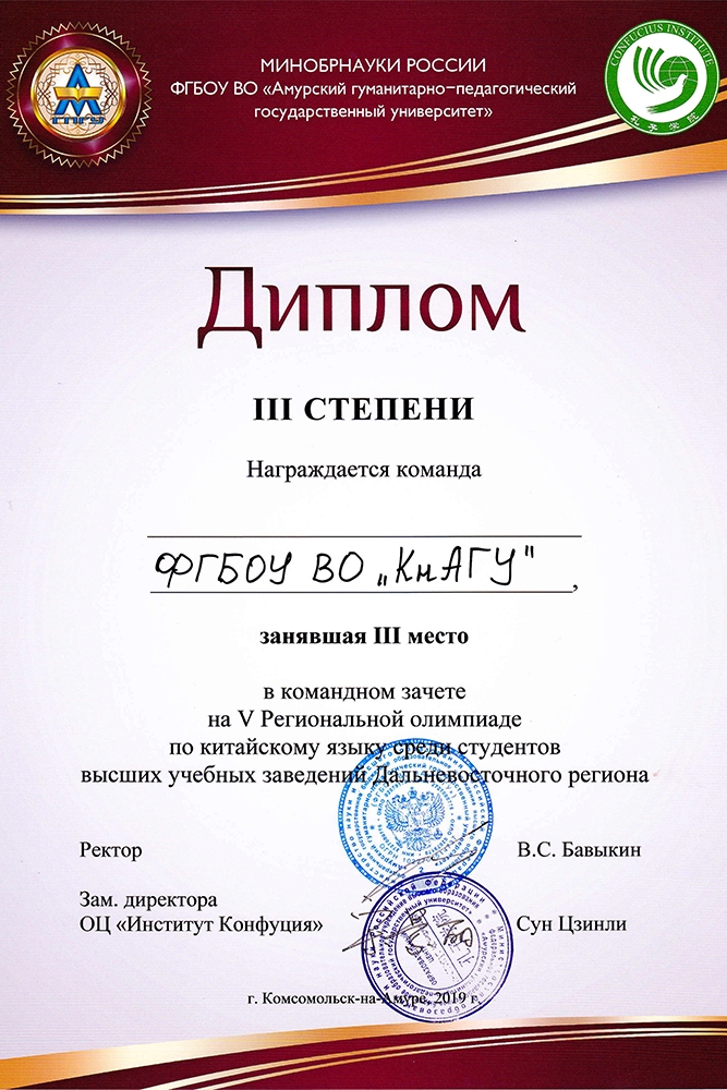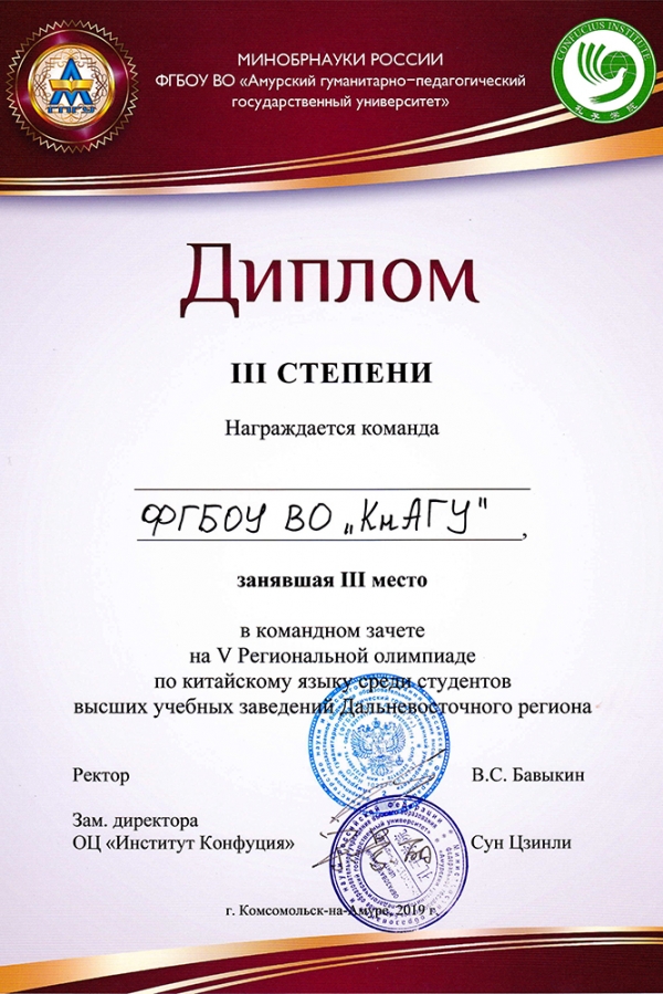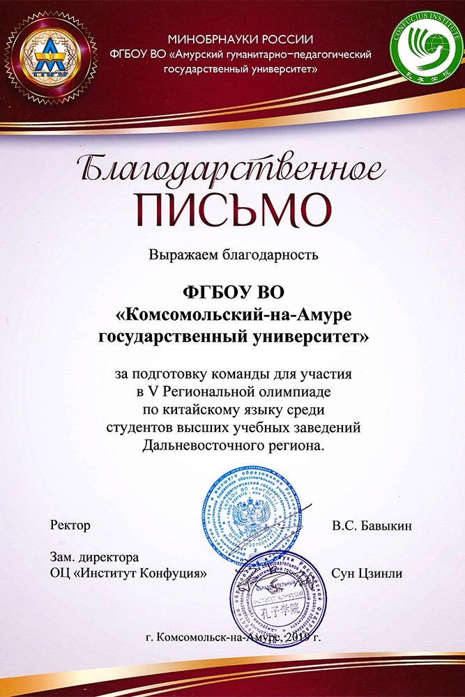 22 февраля 2019 г. в Комсомольске-на-Амуре состоялась V олимпиада по китайскому языку среди студентов высших учебных заведений Хабаровского края и Еврейской автономной области. В мероприятии приняли участие команды Амурского гуманитарно-педагогического государственного университета, Благовещенского государственного университета, а также студенты социально-гуманитарного факультета Комсомольского-на-Амуре государственного университета Михаил Оленин (гр. 6БЛб-1), Евгения Сорокина (гр. 4ПП), Анна Синичкина (гр. 4ПП), Ангелина Тихонова (гр. 7МЛМ-1).
