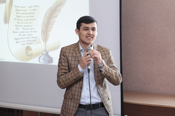 Джуманазар Курбонназаров (ЭТФ), который трогательно прочитал два стихотворения: одно на таджикском языке – «Родина моя Таджикистан» (автор Юсуфджон Ахматзода), другое на русском языке – «Берегите маму» (автор Елена Раннева): «Прочитав объявление о мероприятии на сайте университета, я с нетерпением стал ждать поэтическую встречу, так как мне очень нравится читать стихи. Я очень люблю свою Родину и маму, потому что Родина – это мама, мама – это Родина; без них человек не сможет жить. Все студенты очень активно участвовали. Особенно понравились яркие и интересные выступления Ходжазода Назари Назри и Эмиля Енина».