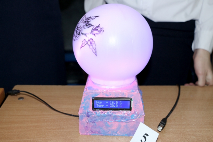Команда «КПД» из МОУ СОШ № 35 г. Комсомольска-на-Амуре в составе Дмитрия Корнукова, Николая Лустина и Анастасии Хохловой представили проект «Умный офис»: «В нашем проекте представлен контроль климата и освещения, производится выведение на дисплей значения температуры и уровня влажности окружающего воздуха. При отклонении показателей температуры и влажности воздуха от заданных параметров автоматически происходит проветривание помещения. Можно управлять системой контроля климата удалённо с помощью телефона», – рассказала Анастасия Хохлова.