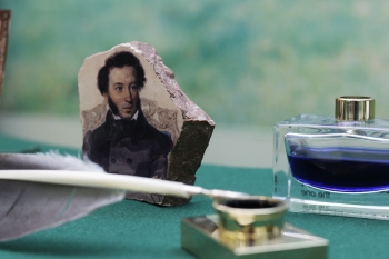 Тёплой встрече студентов с поэтом способствовало и стилизованное оформление читального зала в стиле пушкинской эпохи: старинный подсвечник – канделябр, портрет А. С. Пушкина на камне, гусиное перо и чернильница как символ литературного творчества и поэзии. Именно такими перьями поэт привык писать ещё с лицейских лет. Участники мероприятия, особенно иностранные студенты, с интересом познакомились с выставкой-экспозицией «Читаем пушкинские строки» и книжной выставкой «Он – наш поэт, он – наша слава!..».