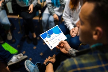 Ильин Евгений: На форуме я посетил мастер-класс «Оказание первой медицинской помощи», где нам подробно рассказывали и показывали, что надо делать при оказании медпомощи пострадавшему при разных ситуациях. Далее я посетил тренинг «Сострадание», где нас учили открываться людям, выражать свои эмоции. На второй день форума я прошёл основной тренинг «Я не Я», суть которого заключалась в том, чтобы почувствовать себя человеком с ограниченными возможностями здоровья. В ходе жеребьёвки я «лишился» левой руки и в дальнейшем проходил тренинг с одной правой. При прохождении тренинга большое внимание уделялось командной работе, я и мои товарищи по команде много раз помогали ребятам, оставшимся без глаз, ног и т.п.