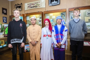 Продолжилась программа выставкой-презентацией «Мы разные, но мы вместе». Участники узнали некоторые национальные особенности костюмов таджиков, мьянманцев, элементы национальной одежды киргизов и других народов. Особый интерес вызвало присутствие нарядных молодых людей – студентов из Мьянмы Пьей Зон Аунг и Мин Ко Ко и девушки из Таджикистана Каримовой Рухшоны, которые сами представили свои национальные костюмы.