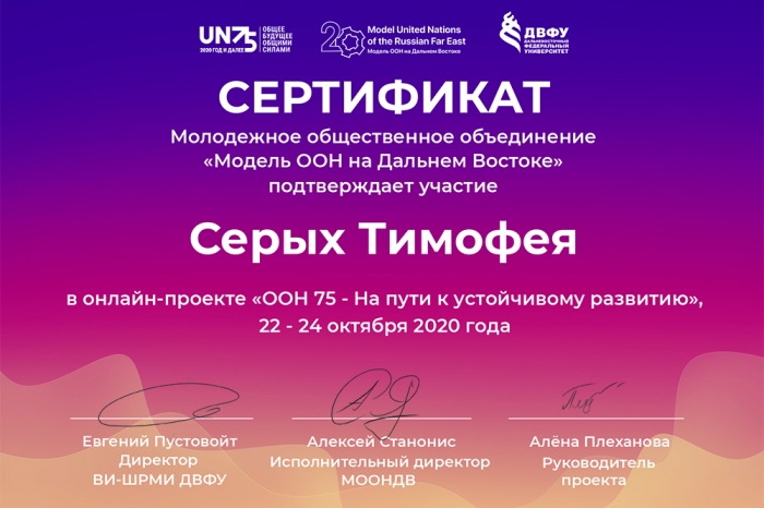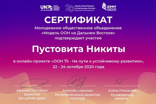 В 2020 году Организация Объединенных Наций отмечает свою годовщину – 24 октября ООН исполнилось 75 лет. В период огромных потрясений для всего мира, нам особенно необходимы диалог и обсуждение приоритетов для человечества. Так, с 22 по 24 октября прошел онлайн-проект «ООН 75 – На пути к устойчивому развитию», в котором приняли участие более 50 студентов из таких городов как Владивосток, Благовещенск, Братск, Комсомольск-на-Амуре, Москва, Нижний Новгород, Санкт-Петербурга и Томск. Организатором мероприятия выступило молодежное общественное объединение «Модель ООН на Дальнем Востоке» (МООНДВ).