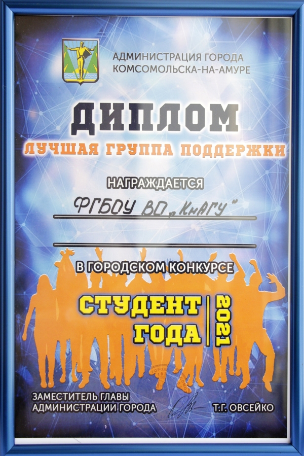 В завершение мероприятия все конкурсанты были награждены дипломами участников городского конкурса «Студент года». Церемонию награждения провёл начальник управления по физической культуре, спорту и молодёжной политике администрации г. Комсомольска-на-Амуре Д. А. Заплутаев. В номинации «Лучшая группа поддержки» победу одержала команда студентов КнАГУ. Ребята отлично постарались и смогли на достойном уровне поддержать наших конкурсантов.