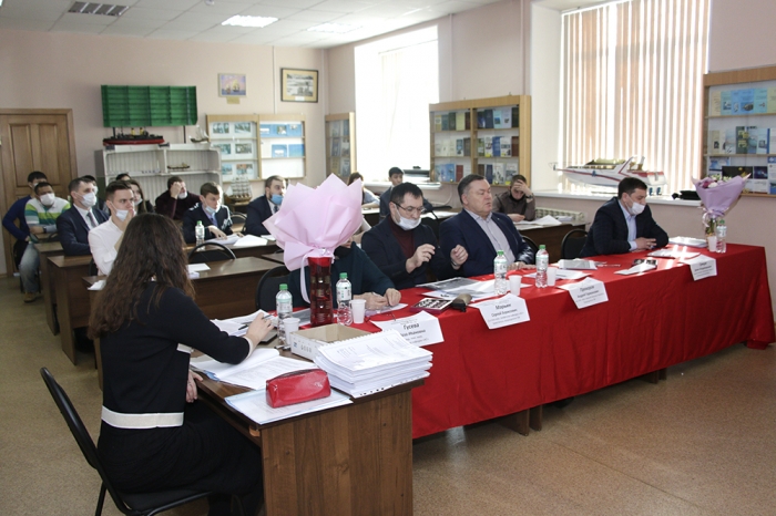 Дипломные проекты оценивались государственной экзаменационной комиссией, в состав которой вошли ведущие специалисты – представители работодателей: Филиала ПАО «Компания «Сухой» «КнААЗ им. Ю. А. Гагарина», ПАО «Корпорация «Иркут» Филиал «Региональные самолёты» Производственный центр в г. Комсомольске-на-Амуре, а также заведующий кафедрой «Авиастроение» доктор технических наук Марьин Сергей Борисович и доцент кафедры кандидат технических наук Гусева Роза Ивановна.