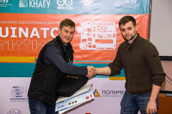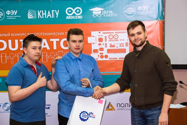 19 мая 2021 года в КнАГУ состоялось торжественное вручение грамот победителям регионального конкурса робототехнических проектов Arduinator-2021. Торжественное награждение среди участников, проживающих в г. Комсомольске-на-Амуре, провел начальник отдела организации проектной работы обучающихся В. В. Солецкий. Дипломы победителей и памятные подарки участникам из других регионов оргкомитет направил по почте.