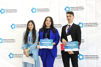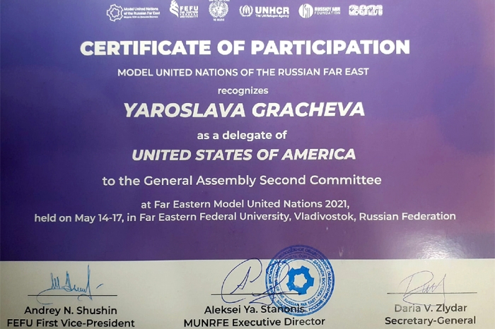 Студенты Комсомольского-на-Амуре государственного университета приняли участие в конференции «Дальневосточная модель ООН 2021 (ДВМООН)» (14-17 мая 2021 года, г. Владивосток). Команду университета представляли студенты кафедры лингвистики и межкультурной коммуникации социально-гуманитарного факультета Ярослава Грачева и Илья Турбанов.
