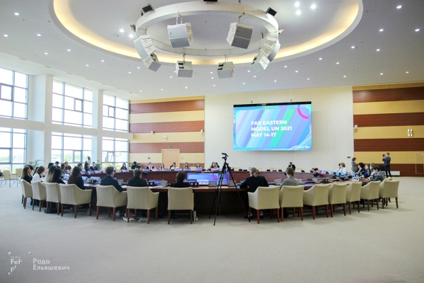 Конференция ДВМООН 2021 проходила в смешанном формате: работа одного комитета проходила в онлайн-формате, заседания двух других – в очном режиме на кампусе ДВФУ (г. Владивосток, о. Русский). Официальным языком конференции является английский.