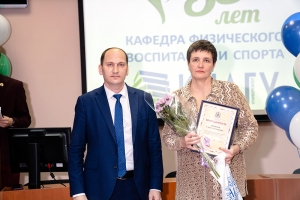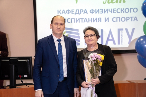 Затем с поздравительной речью к присутствующим обратилась проректор по учебной, воспитательной работе и общим вопросам Т. Е. Наливайко: «Кафедра физвоспитания и спорта, несмотря на свой приличный возраст, остаётся молодой и перспективной для дальнейшего развития. Каждый преподаватель кафедры вложил свою лепту в подготовку высококвалифицированных спортсменов, а также приложил усилия, чтобы массовый спорт в университете набрал такие высокие обороты, которые позволяют нам всегда выступать достойно и занимать призовые места. Поздравляю кафедру с юбилеем, желаю преподавателям труда, терпения в работе со студентами, здоровья, студентам желаю спортивных успехов!». Татьяна Евгеньевна отметила важное значение спортивных секций и кружков, которые на постоянной основе действуют в вузе и охватывают большое количество студенческой молодёжи.