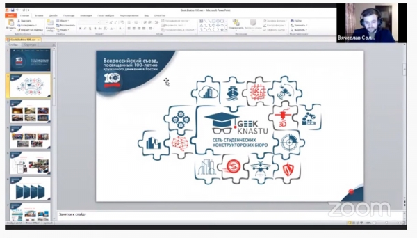 На Всероссийском съезде сеть студенческих конструкторских бюро представил начальник отдела организации научных и проектно-конструкторских работ студентов Вячеслав Солецкий. Он принял активное участие в качестве спикера в работе круглых столов «Организация кружка на базе вуза: форматы работы, возможные сложности и лучшие практики» и «Среда развития технического образования и творчества». Вячеслав Солецкий рассказал об истории образования сети Geek.Knastu, взаимосвязи внутри вуза между проектной работой, преподавателями, студентами и абитуриентами, поделился трудностями и своим видением причины успеха сети, а также ответил на вопросы коллег.