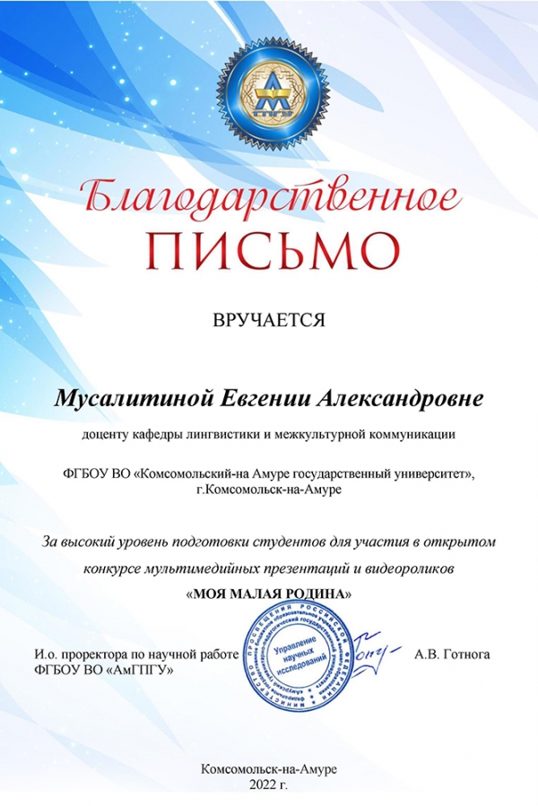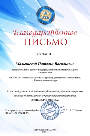 С 18 по 27 апреля 2022 года кафедрой иностранных языков Амурского гуманитарно-педагогического государственного университета проводился открытый конкурс мультимедийных презентаций и видеороликов на иностранных языках «Моя малая Родина».