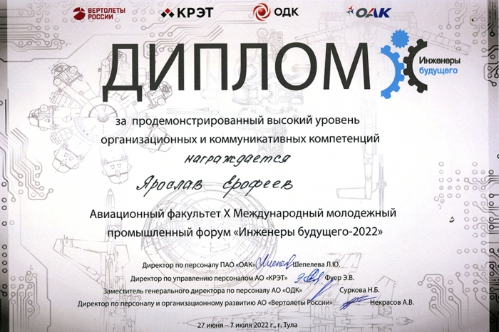 Студент КнАГУ вошёл в число лучших участников авиационного факультета X Международного молодёжного промышленного форума «Инженеры будущего 2022»