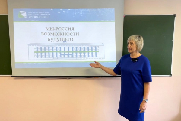 Первое занятие «Россия – страна возможностей» провела директор колледжа И. В. Конырева. В своей беседе со студентами колледжа она рассказала о реализуемых в стране масштабных проектах в различных областях промышленности и экономики, о том, что в КнАГУ и колледже предоставляются студентам равные и разнообразные возможности, чтобы каждый мог проявить себя, реализовать свои таланты и профессиональный потенциал, воплотить в жизнь бизнес-идеи или общественные инициативы.
