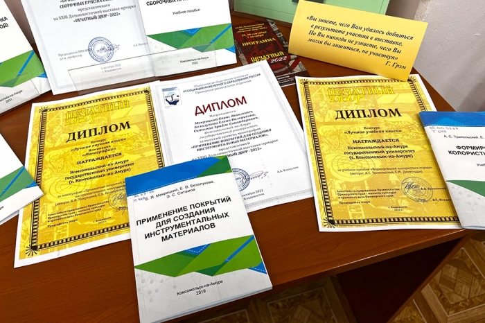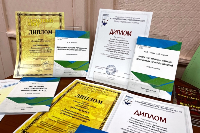 В научно-технической библиотеке открыта выставка учебных и научных изданий КнАГУ, получивших дипломы XXIII Дальневосточной выставки-ярмарки «Печатный двор-2022».