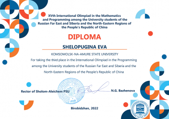 26 ноября 2022 года студенты факультета компьютерных технологий Комсомольского-на-Амуре государственного университета приняли участие и стали призёрами 15-й Международной олимпиады по математике и программированию среди студентов вузов Дальнего Востока, Сибири и Северо-Восточных регионов Китайской Народной Республики.