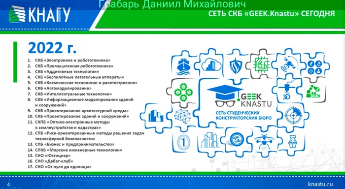 От нашего университета в секции «Вовлечение молодёжи в науку» с докладом на тему «Вовлечение студенческой молодёжи в науку в рамках Сети СКБ “Geek.Knastu”» в онлайн-формате выступил Грабарь Даниил, председатель студенческого научного сообщества КнАГУ «Сеть студенческих конструкторских бюро Geek.Knastu». Даниил рассказал о деятельности сети СКБ за последний год, каких высоких результатов добилась сеть за счёт выигранных грантов: гранта на реализацию мероприятий, направленных на поддержку студенческих научных сообществ от Министерства науки и высшего образования РФ (3 млн рублей) и гранта от Федерального агентства по делам молодёжи (Росмолодёжь) на реализацию Молодёжного фестиваля технического творчества «ТехноФест-2022» (4,7 млн рублей).