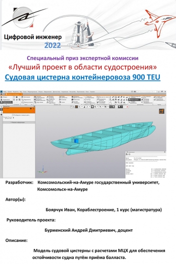 - проект «Судовая цистерна контейнеровоза 900TEU» студента группы 2КСм-1 Боярчука Ивана;